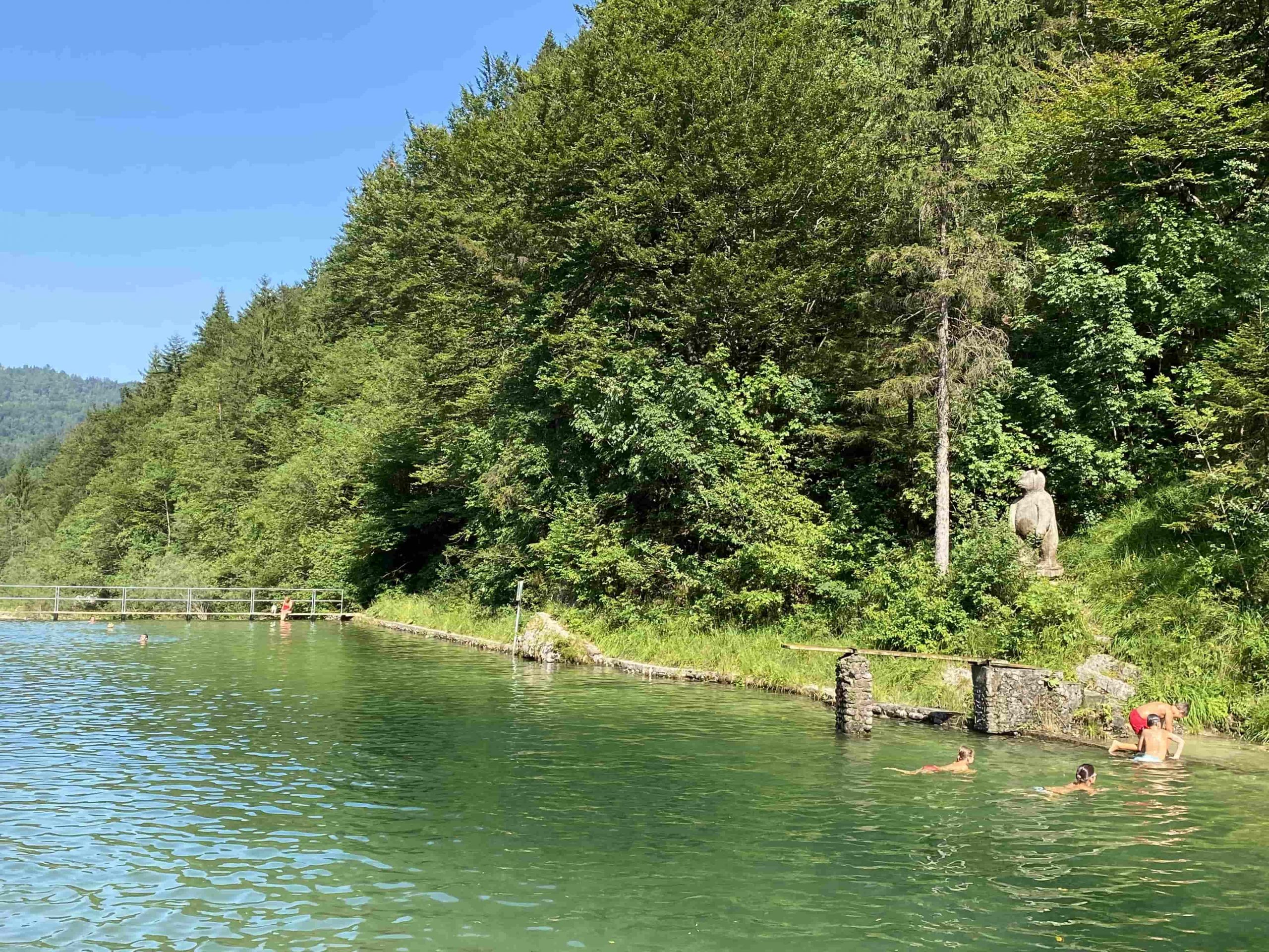 Lajšt im Naturpark Idija liegt weitab der Hauptstraße, mitten im Wald. Dort trifft der Bach Bela auf den Fluss Idijca und gemeinsam erfrischen sie Badehungrige in einem aufgestauten Becken. Beobachtet werden diese dabei von einem neugierigen Bären, der neben der improvisierten Sprungstelle aus dem Wald auftaucht – zum Glück ist er nur aus Holz. Für die Einheimischen ist dieser idyllische Ort, insbesondere an Wochenenden, ein beliebtes Ausflugsziel. Da kann es auch schon mal voll werden rund um die rustikale „Kopališče“-Bar – etwas Adria-Feeling mitten im Wald.