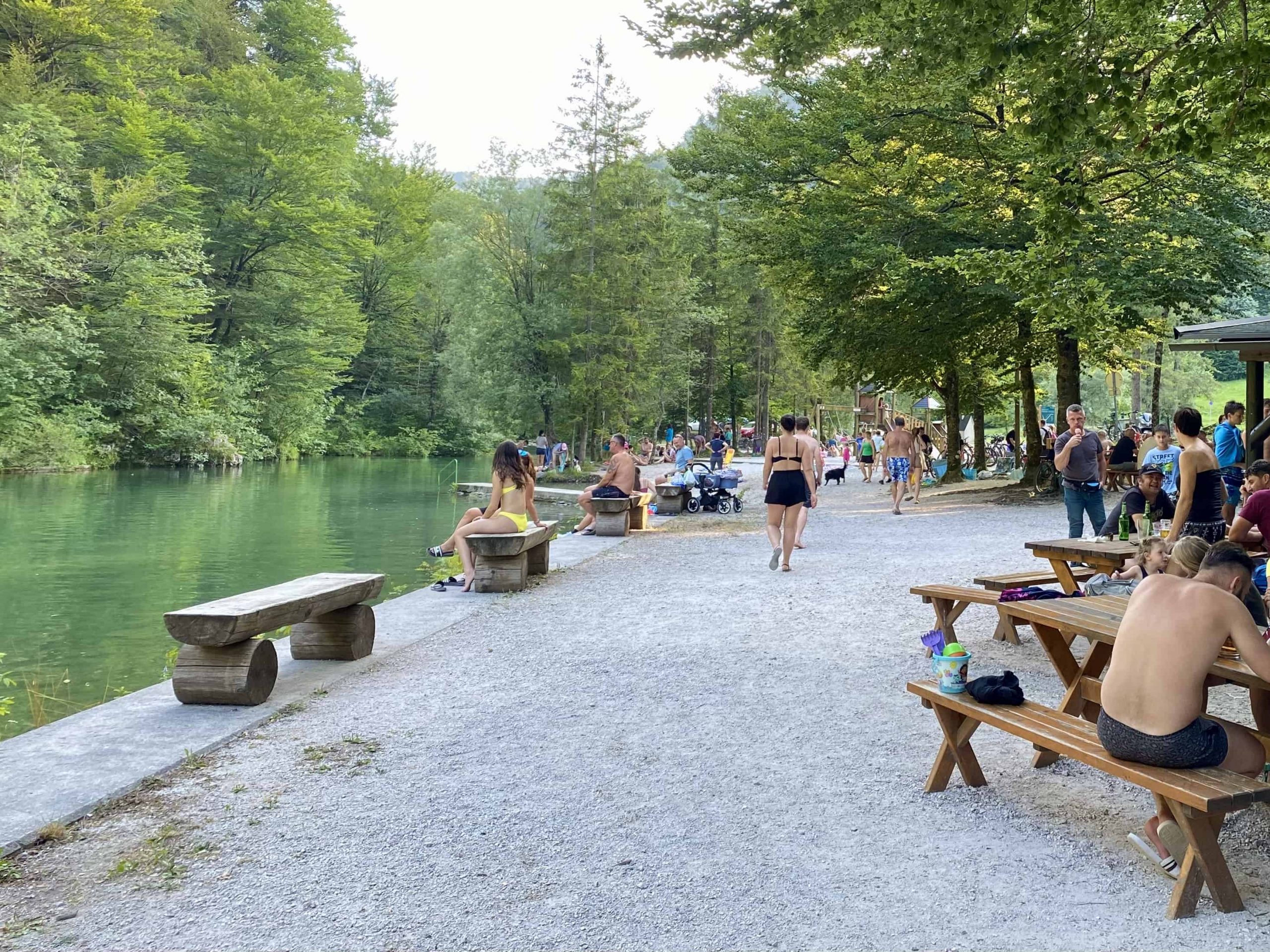 Badestelle Lajšt: viele schattige und verschiedene Liegemöglichkeiten am Fluss und am Bach