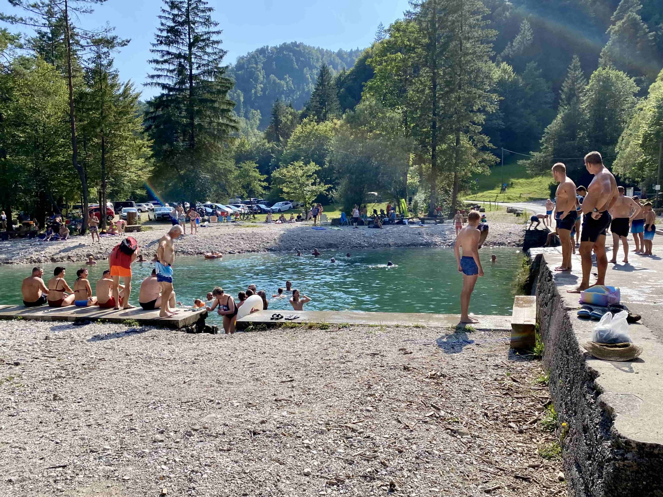 In gut 20 km Entfernung, am Rand des Ortes Žiri, findet sich unter ausgedehnten Wiesen die Badestelle Pustotnik. Wegen der Nähe zur Quelle des Flusses Poljanska Sora ist das Wasser hier im aufgestauten Naturbecken besonders frisch und klar. Und für uns gibt es an diesem Tag nichts Schöneres auf der Welt, als hier vom blauen Sprungbrett ins Wasser abzutauchen. Ein weiterer kleiner Luxus sind die Liegestühle auf der Betonfläche, wo man sich immer wieder in die Sonne legen und aufwärmen kann, um dann wieder in die Sora zu springen. „Kopališče“ – für uns ein Zauberwort.