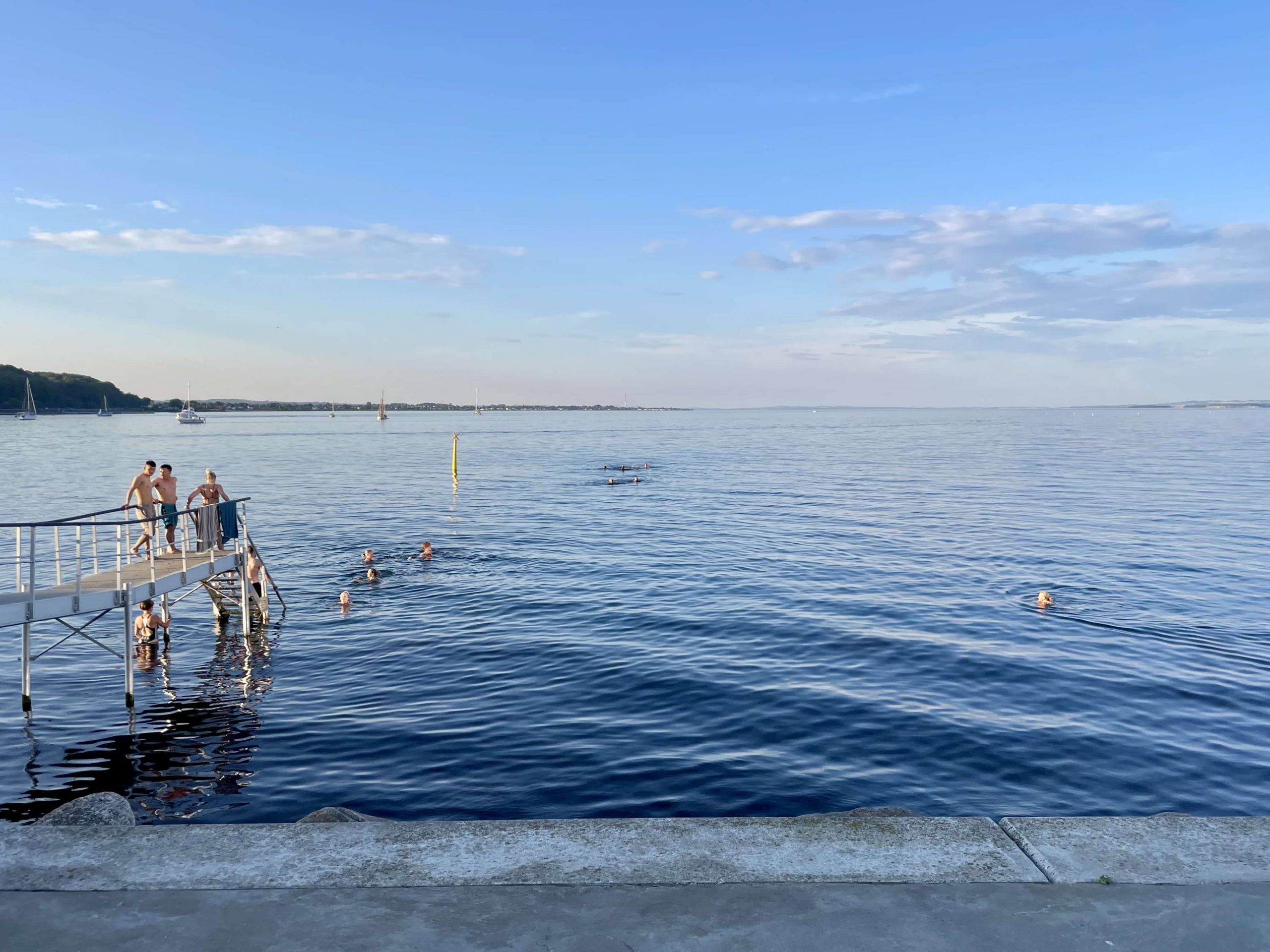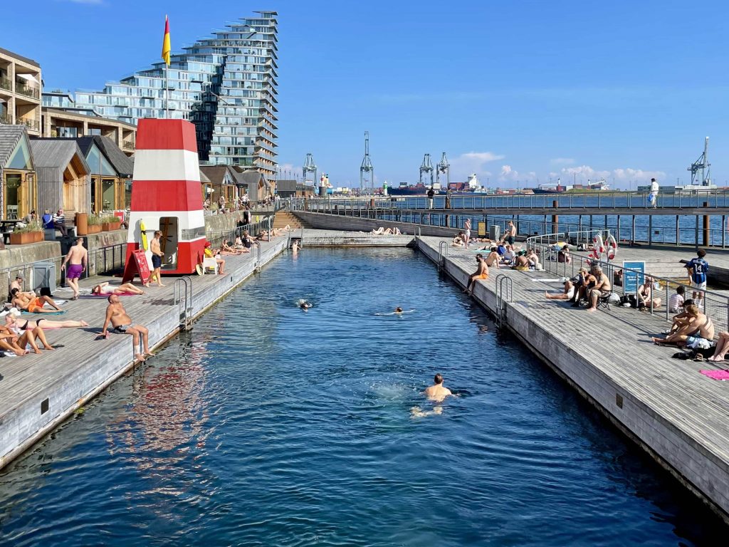 Angelockt von einem Foto in einem Magazin und der Info, dass es sich beim Hafenbad „Bassin 7“ um das größte Hafenbad der Welt handle, haben wir uns auf den Weg nach Aarhus Ø gemacht, ein relativ neues und futuristisch anmutendes Hafenviertel. Entdeckt haben wir dann gleich zwei Bade-Highlights. Das berühmtere ist das besagte Hafenbad „Bassin 7“ vom Architekten Bjarke Engels. Eine dreieckige, hölzerne Plattform mit einer umlaufenden Promenade, auf der man rund um die Uhr wunderbar flanieren kann, ragt in das Hafenbecken Nummer 7 hinein. Der Zutritt zum Bad im Inneren mit 50-Meter-Becken, einem runden Tauchbecken mit Sprungstelle und einem Kinderbecken ist kostenfrei, und auf der hölzernen Liegefläche fühlt man sich dann ein bisschen wie an Deck eines Schiffes. – allerdings nicht wie auf hoher See, sondern permanent am Kai vertaut. Und hier, am Kai, erstreckt sich der Lido von Aarhus, eine belebte und moderne Hafenpromenade mit Cafés und Restaurants, die in Tiny-Houses untergebracht sind, sogar schlafen kann man in einigen dieser Minihäuser. Wenn schon um 18 Uhr das Bad schließt, im Sommer also quasi mitten am Tag, hieß es für uns schnell rüber auf die andere Seite des Aarhus Ø-Viertels, vorbei an den berühmten besonders spitzen und zackigen Wohnhäusern, genannt „Eisberge“, zum weniger berühmten, aber nicht minder überraschenden Hafenbad am Tikjøbs Plads. Hier sind einfach ein paar ausladende Metalltreppen in die Ostsee gebaut, welche an Sommerabenden golden glitzern und schimmern. Deshalb kommen um diese Zeit hier viele Aarhusianer vorbei, um mit einem Sprung ins Meer den Sommertag zu beenden.