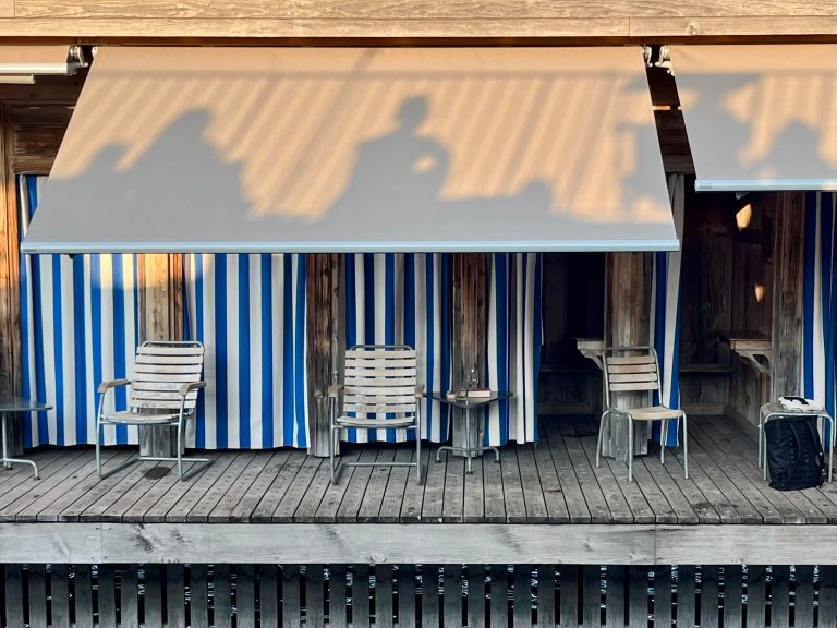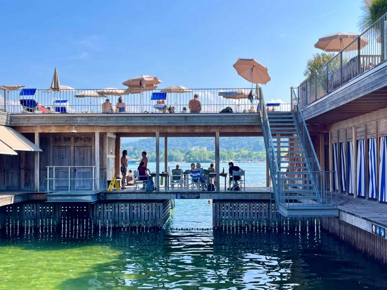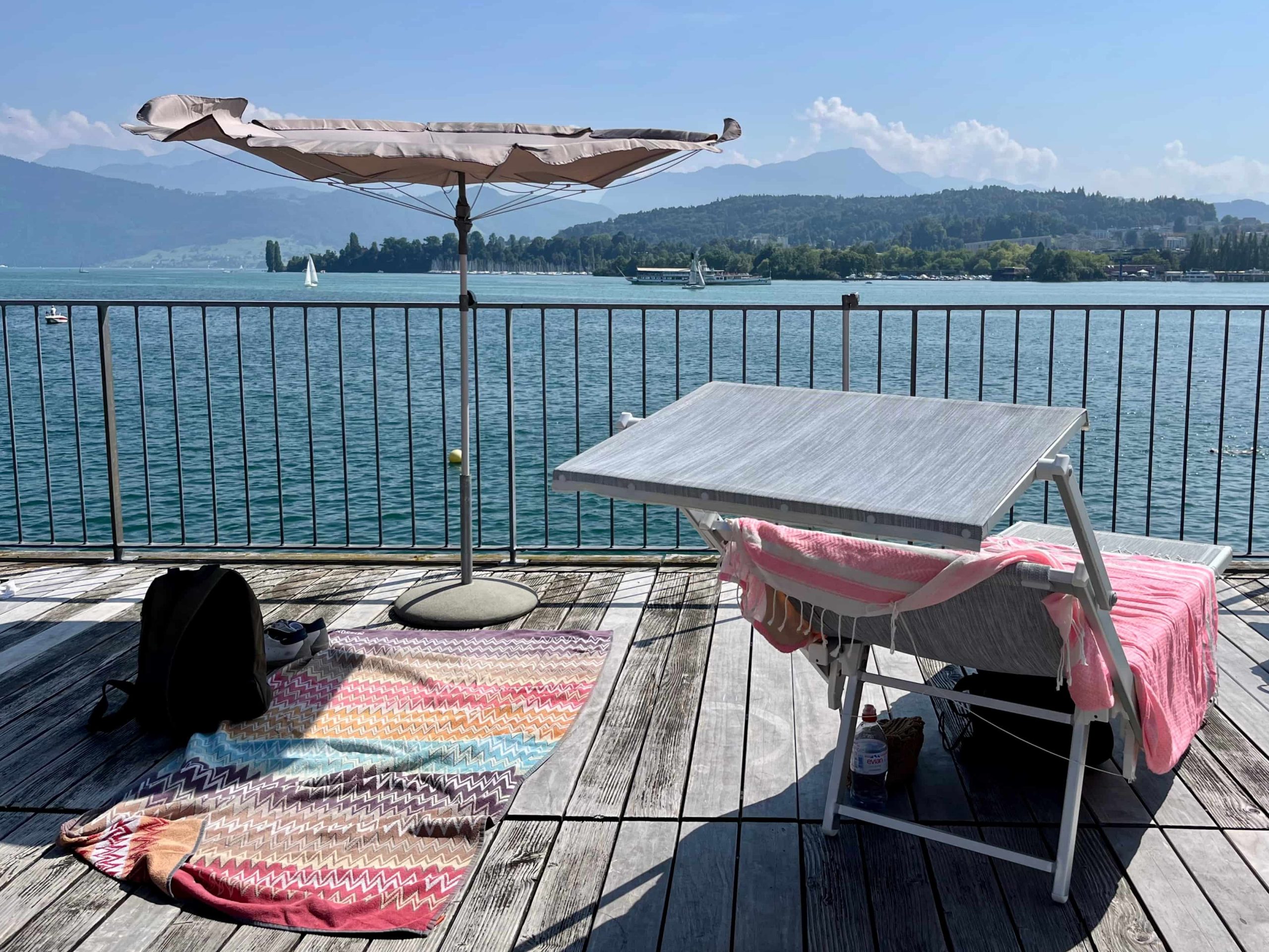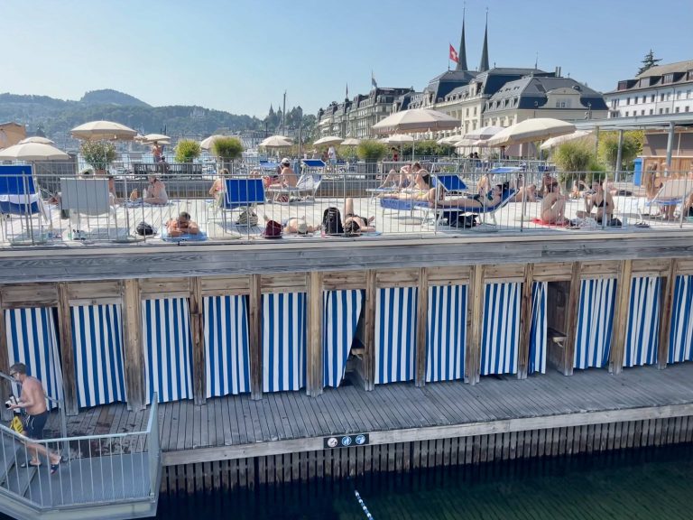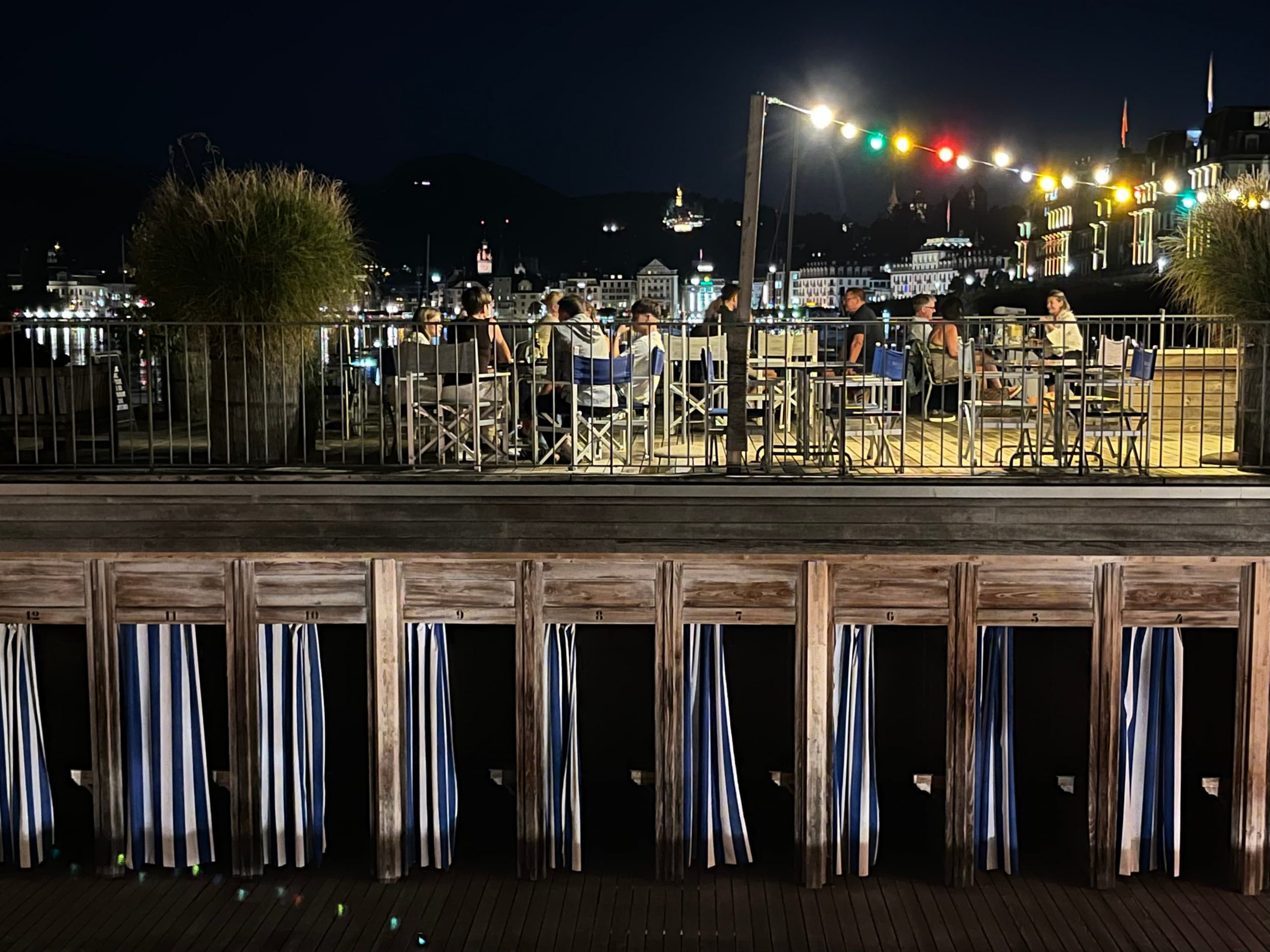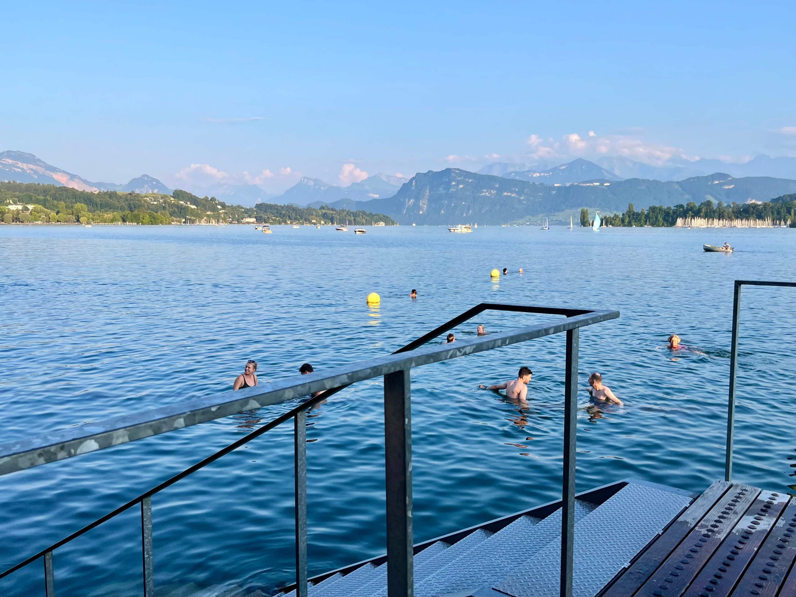 Eingeladen von Lili ins historische Seebad Luzern haben wir einen der schönsten Badetage verbracht. Über eine kleine Brücke gelangt man in die auf Holzpfählen stehende „Badi“, wie die Schweizer sagen. Blickt man dann vom Sonnendeck aus auf’s luxuriöse Palace Hotel direkt gegenüber, fragt man sich kaum, wo es denn eigentlich schöner ist. Unser hölzernes Kastenbad am Nationalquai kann mit den hiesigen Belle Époque-Grandhotels jedenfalls absolut mithalten. Ob sich sonnend auf den Holzterrassen oder im grünen See schwimmend, der Blick übers Wasser in die Berge lässt einen nicht mehr los. Aber auch die Badi selbst –Innenhöfe (früher getrennt in Frauen- und Männerbereich) mit Umkleidekabinen und Seewasserbecken für die Nichtschwimmer – ist einmalig schön. Der Platz auf der Holzinsel ist deshalb beliebt und leider auch begrenzt, weshalb man seit einiger Zeit dazu übergegangen ist, keine Gruppen mit mehr als 6 Personen an Bord zu lassen. Wir hatten hier einen wirklich besonders traumhaften Badetag! Und er war nach Badeschluss längst noch nicht vorbei. Denn an diesem Ort kann man unter freiem Himmel mit einfachen und guten Gerichten auch noch den Abend verbringen! Man will jeden Tag herkommen. So wie Lili. Danke für die Einladung, Lili!